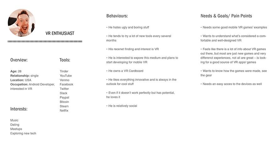 Based on the research and qualitative data, the following Personas were discovered: World Changer as a Primary Persona, VR Enthusiast and VR Discoverer as Secondary Personas. More of the Persona creation process is here.